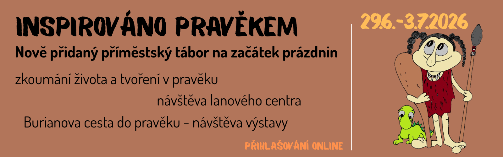 Příměstský tábor inspirovaný životem v pravěku. Čeká nás výlet do lanového parku, ochutnávka výtvarného tvoření i jídla pravěkých lidí, výatava Zdeňka Buriana "Cesta do pravěku" a únikovka